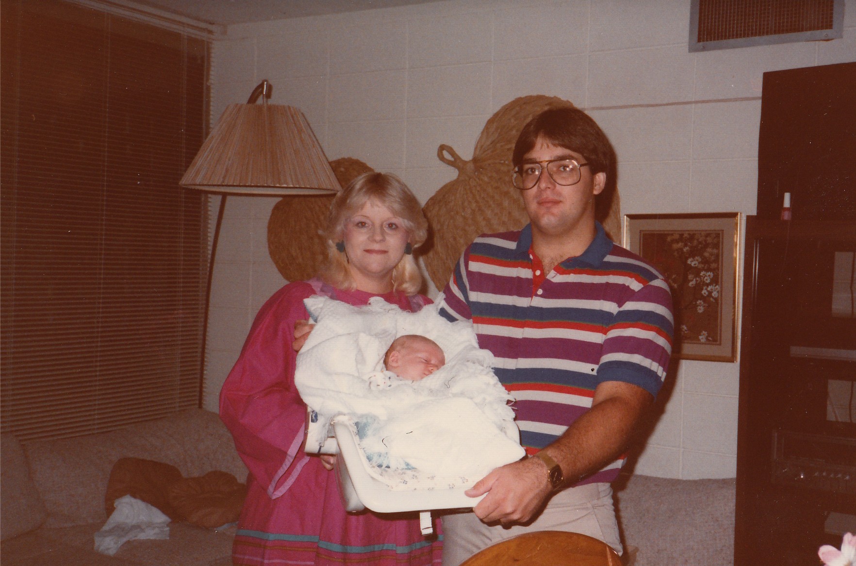 So many blessings that summer and people to thank……my dear friend Blanche and the ladies of First Baptist Stillwater for my baby shower, Glendora for keeping me and the apartment looking pretty, Ramona for never leaving our side that long week, to the staff at Stillwater Hospital (wonder if they remember Skip Gore who would buy them Braums burgers and shakes that week), and, the rest of our families who showered us with love……Mother, Daddy and John who came immediately; Jim, right there, too; Karen and Dusty who bought him his “going home suit,” Pat and Joe, who along with gifts for JM, brought me a pretty new summer dress.